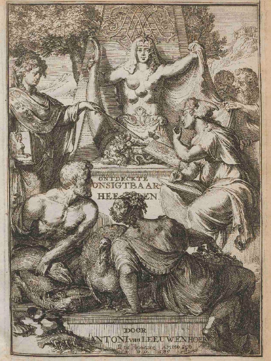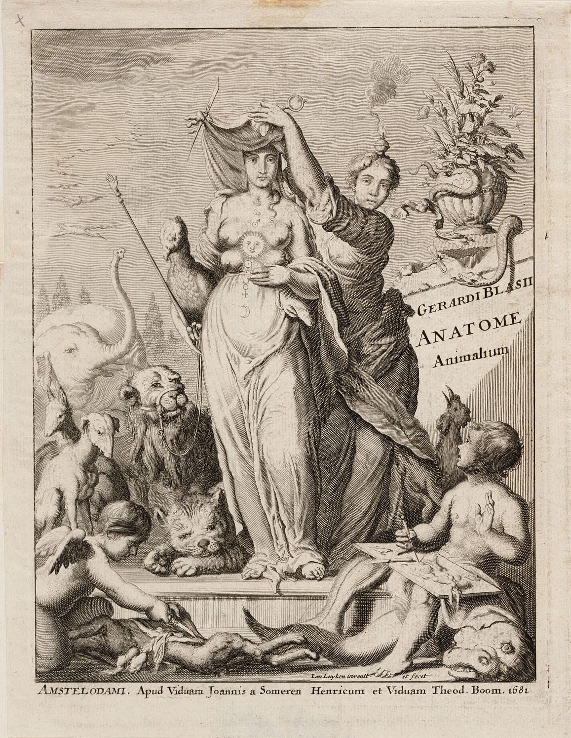 Science unveiling Nature. Engraving by Jan Luyken, for a 1681 work of zoological anatomy by Gerard Blasius. Here Science is removing the Veil of Isis, a longstanding mystic symbol of the unknowability of Nature’s ways, which Plutarch attributes to the ancient Egyptians. In the Age of Enlightenment, Dutch scientists like Blasius repurposed it as a symbol of their triumph. Note the astrological symbols of the classical planets, and the angel dissecting a beast.