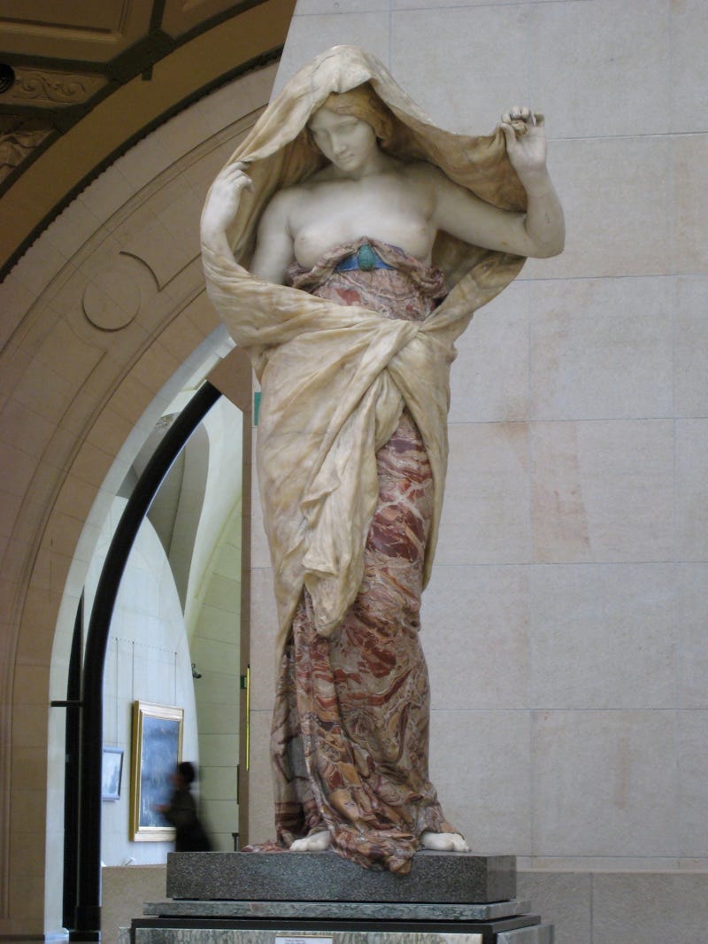 Nature Unveiling Herself Before Science. Sculpture by Louis-Ernest Barrias, 1899. She wears a scarab as a reference to the Egyptian origin of the Veil of Isis.