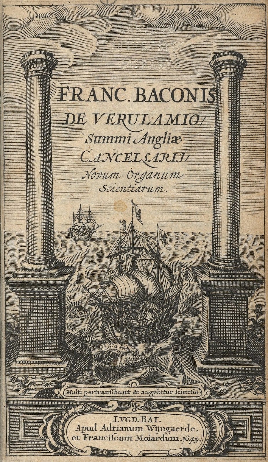 A ship passes the Pillars of Hercules, symbolizing the edge of the known world, into a vast ocean depicted with a pair of open eyes. Engraving by Simon de Passe, for Francis Bacon’s Novum Organum. The Latin tag is a quotation from the Book of Daniel’s apocalyptic prophecies, and translates as “Many shall run to and fro, and knowledge shall be increased.”